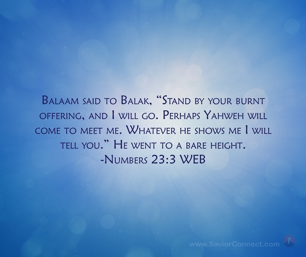 Balaam said to Balak, “Stand by your burnt offering, and I will go. Perhaps Yahweh will come to meet me. Whatever he shows me I will tell you.” He went to a bare height. -Numbers 23:3 WEB