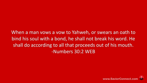 When a man vows a vow to Yahweh, or swears an oath to bind his soul with a bond, he shall not break his word. He shall do according to all that proceeds out of his mouth. -Numbers 30:2 WEB