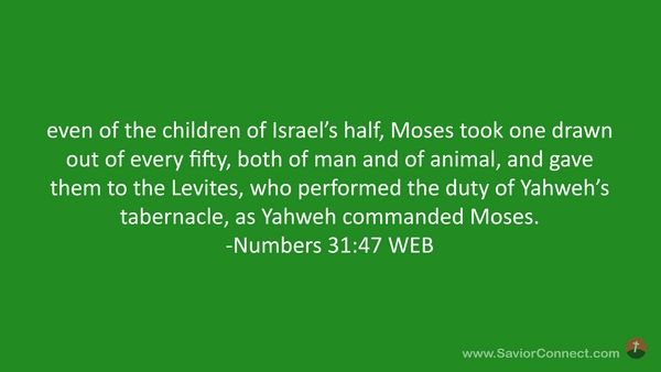 even of the children of Israel’s half, Moses took one drawn out of every fifty, both of man and of animal, and gave them to the Levites, who performed the duty of Yahweh’s tabernacle, as Yahweh commanded Moses. -Numbers 31:47 WEB