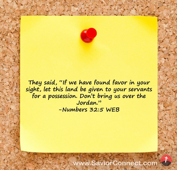 They said, “If we have found favor in your sight, let this land be given to your servants for a possession. Don’t bring us over the Jordan.” -Numbers 32:5 WEB