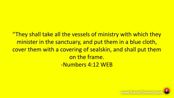 “They shall take all the vessels of ministry with which they minister in the sanctuary, and put them in a blue cloth, cover them with a covering of sealskin, and shall put them on the frame. -Numbers 4:12 WEB