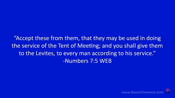 “Accept these from them, that they may be used in doing the service of the Tent of Meeting; and you shall give them to the Levites, to every man according to his service.” -Numbers 7:5 WEB