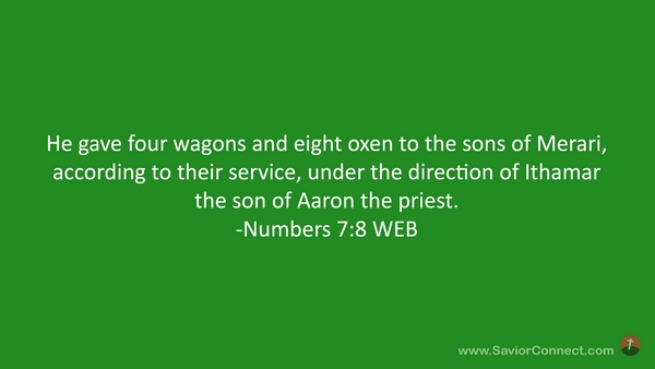 He gave four wagons and eight oxen to the sons of Merari, according to their service, under the direction of Ithamar the son of Aaron the priest. -Numbers 7:8 WEB