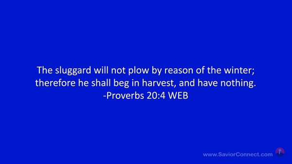 The sluggard will not plow by reason of the winter; therefore he shall beg in harvest, and have nothing. -Proverbs 20:4 WEB