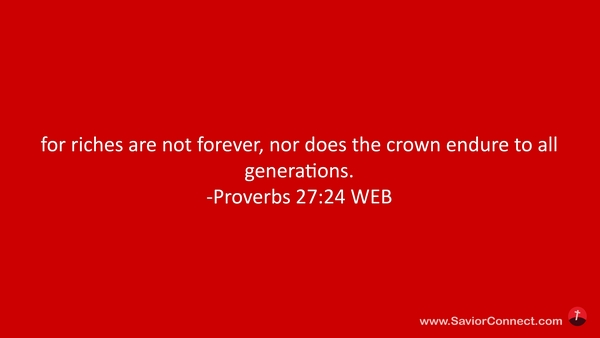 for riches are not forever, nor does the crown endure to all generations. -Proverbs 27:24 WEB