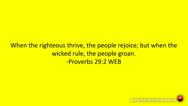 When the righteous thrive, the people rejoice; but when the wicked rule, the people groan. -Proverbs 29:2 WEB