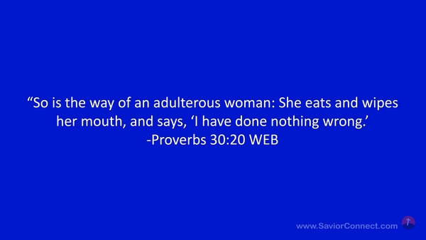 “So is the way of an adulterous woman: She eats and wipes her mouth, and says, 'I have done nothing wrong.’ -Proverbs 30:20 WEB