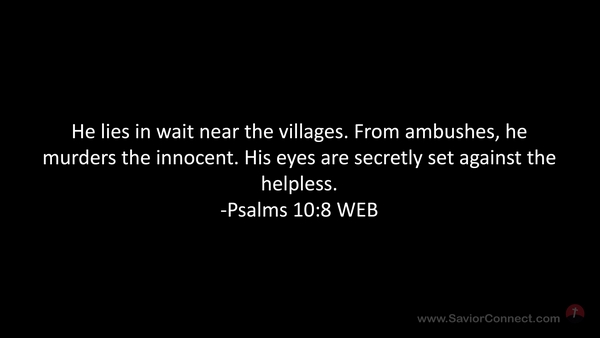 He lies in wait near the villages. From ambushes, he murders the innocent. His eyes are secretly set against the helpless. -Psalms 10:8 WEB