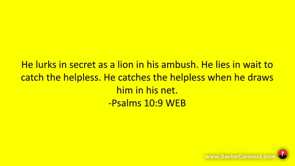 He lurks in secret as a lion in his ambush. He lies in wait to catch the helpless. He catches the helpless when he draws him in his net. -Psalms 10:9 WEB
