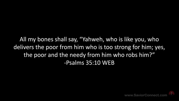 All my bones shall say, “Yahweh, who is like you, who delivers the poor from him who is too strong for him; yes, the poor and the needy from him who robs him?” -Psalms 35:10 WEB