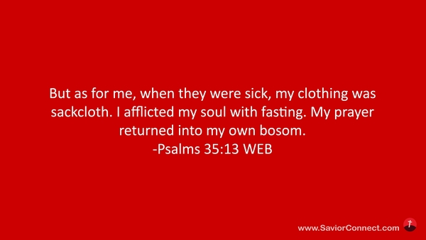 But as for me, when they were sick, my clothing was sackcloth. I afflicted my soul with fasting. My prayer returned into my own bosom. -Psalms 35:13 WEB
