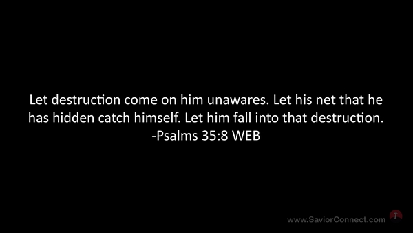 Let destruction come on him unawares. Let his net that he has hidden catch himself. Let him fall into that destruction. -Psalms 35:8 WEB