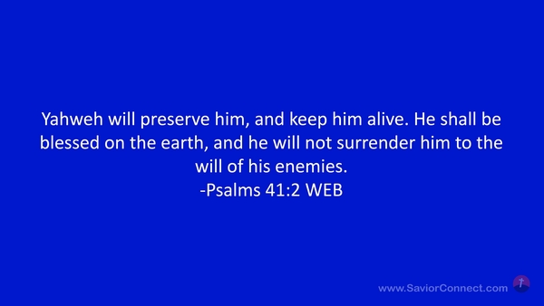 Yahweh will preserve him, and keep him alive. He shall be blessed on the earth, and he will not surrender him to the will of his enemies. -Psalms 41:2 WEB