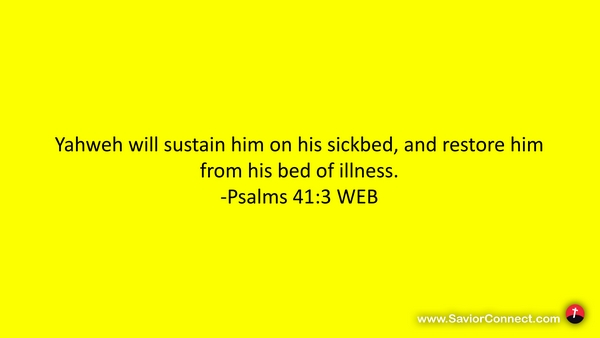 Yahweh will sustain him on his sickbed, and restore him from his bed of illness. -Psalms 41:3 WEB