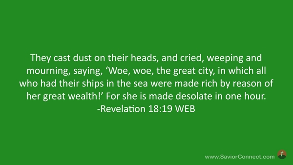 They cast dust on their heads, and cried, weeping and mourning, saying, 'Woe, woe, the great city, in which all who had their ships in the sea were made rich by reason of her great wealth!’ For she is made desolate in one hour. -Revelation 18:19 WEB