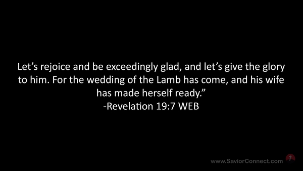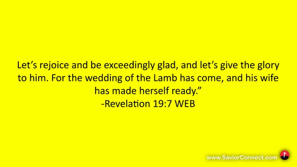 Let’s rejoice and be exceedingly glad, and let’s give the glory to him. For the wedding of the Lamb has come, and his wife has made herself ready.” -Revelation 19:7 WEB