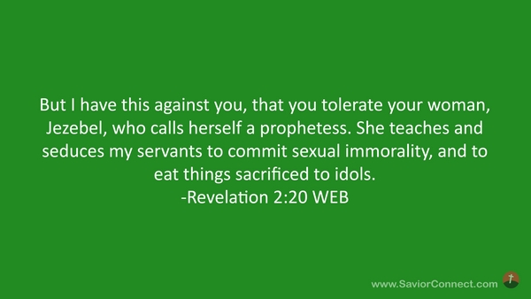 But I have this against you, that you tolerate your woman, Jezebel, who calls herself a prophetess. She teaches and seduces my servants to commit sexual immorality, and to eat things sacrificed to idols. -Revelation 2:20 WEB