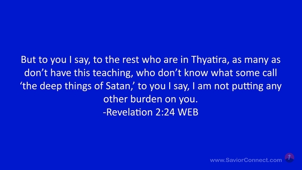 But to you I say, to the rest who are in Thyatira, as many as don’t have this teaching, who don’t know what some call 'the deep things of Satan,’ to you I say, I am not putting any other burden on you. -Revelation 2:24 WEB