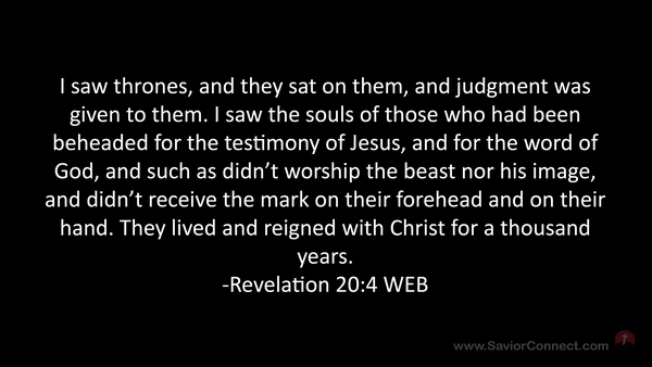 I saw thrones, and they sat on them, and judgment was given to them. I saw the souls of those who had been beheaded for the testimony of Jesus, and for the word of God, and such as didn’t worship the beast nor his image, and didn’t receive the mark on their forehead and on their hand. They lived and reigned with Christ for a thousand years. -Revelation 20:4 WEB