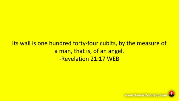 Its wall is one hundred forty-four cubits, by the measure of a man, that is, of an angel. -Revelation 21:17 WEB