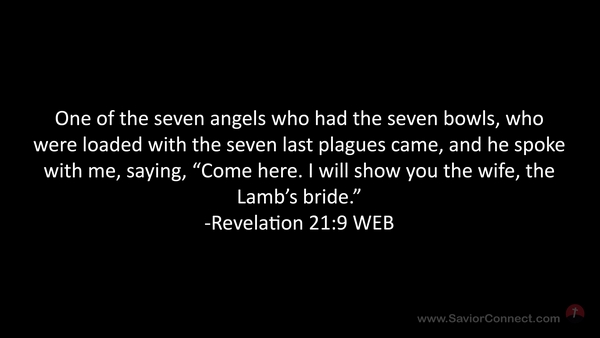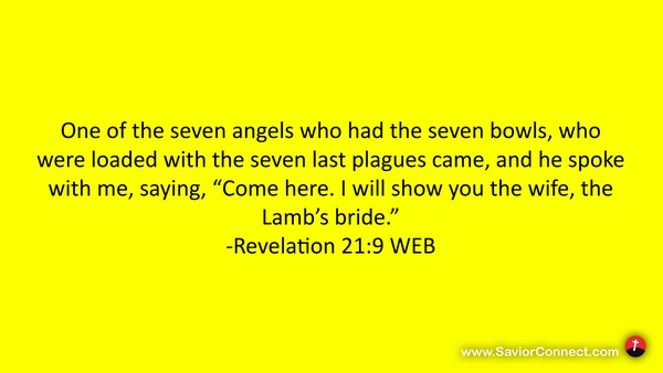 One of the seven angels who had the seven bowls, who were loaded with the seven last plagues came, and he spoke with me, saying, “Come here. I will show you the wife, the Lamb’s bride.” -Revelation 21:9 WEB