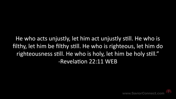 He who acts unjustly, let him act unjustly still. He who is filthy, let him be filthy still. He who is righteous, let him do righteousness still. He who is holy, let him be holy still.” -Revelation 22:11 WEB