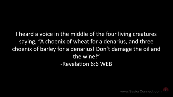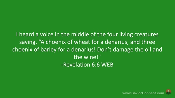 I heard a voice in the middle of the four living creatures saying, “A choenix of wheat for a denarius, and three choenix of barley for a denarius! Don’t damage the oil and the wine!” -Revelation 6:6 WEB