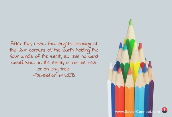 After this, I saw four angels standing at the four corners of the earth, holding the four winds of the earth, so that no wind would blow on the earth, or on the sea, or on any tree. -Revelation 7:1 WEB