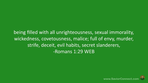 being filled with all unrighteousness, sexual immorality, wickedness, covetousness, malice; full of envy, murder, strife, deceit, evil habits, secret slanderers, -Romans 1:29 WEB
