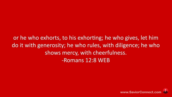 or he who exhorts, to his exhorting; he who gives, let him do it with generosity; he who rules, with diligence; he who shows mercy, with cheerfulness. -Romans 12:8 WEB