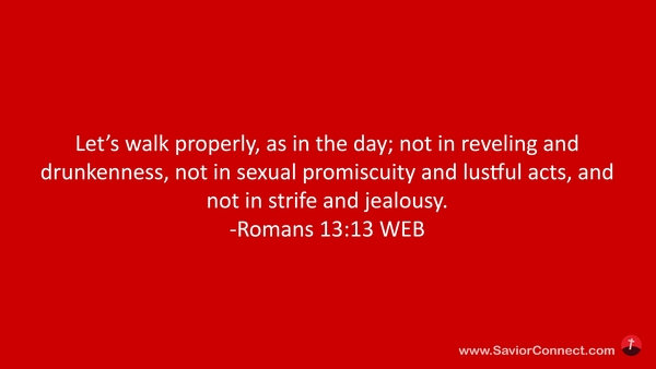 Let’s walk properly, as in the day; not in reveling and drunkenness, not in sexual promiscuity and lustful acts, and not in strife and jealousy. -Romans 13:13 WEB