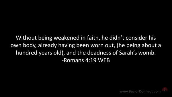 Without being weakened in faith, he didn’t consider his own body, already having been worn out, (he being about a hundred years old), and the deadness of Sarah’s womb. -Romans 4:19 WEB