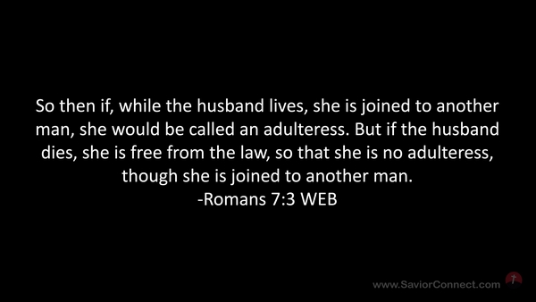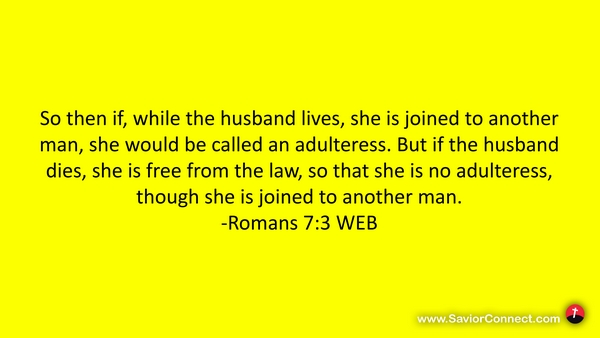 So then if, while the husband lives, she is joined to another man, she would be called an adulteress. But if the husband dies, she is free from the law, so that she is no adulteress, though she is joined to another man. -Romans 7:3 WEB