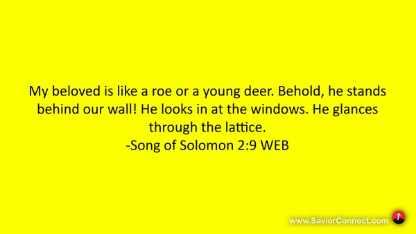 My beloved is like a roe or a young deer. Behold, he stands behind our wall! He looks in at the windows. He glances through the lattice. -Song of Solomon 2:9 WEB