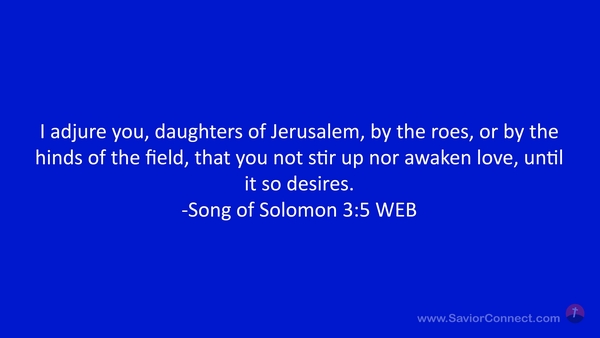 I adjure you, daughters of Jerusalem, by the roes, or by the hinds of the field, that you not stir up nor awaken love, until it so desires. -Song of Solomon 3:5 WEB