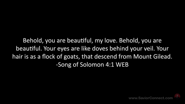 Behold, you are beautiful, my love. Behold, you are beautiful. Your eyes are like doves behind your veil. Your hair is as a flock of goats, that descend from Mount Gilead. -Song of Solomon 4:1 WEB