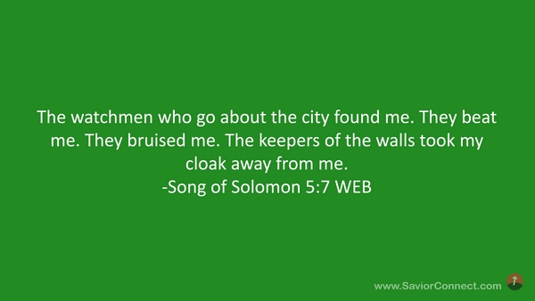 The watchmen who go about the city found me. They beat me. They bruised me. The keepers of the walls took my cloak away from me. -Song of Solomon 5:7 WEB