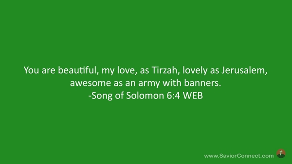 You are beautiful, my love, as Tirzah, lovely as Jerusalem, awesome as an army with banners. -Song of Solomon 6:4 WEB