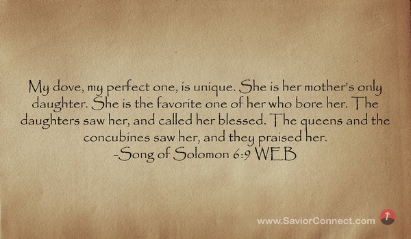 My dove, my perfect one, is unique. She is her mother’s only daughter. She is the favorite one of her who bore her. The daughters saw her, and called her blessed. The queens and the concubines saw her, and they praised her. -Song of Solomon 6:9 WEB
