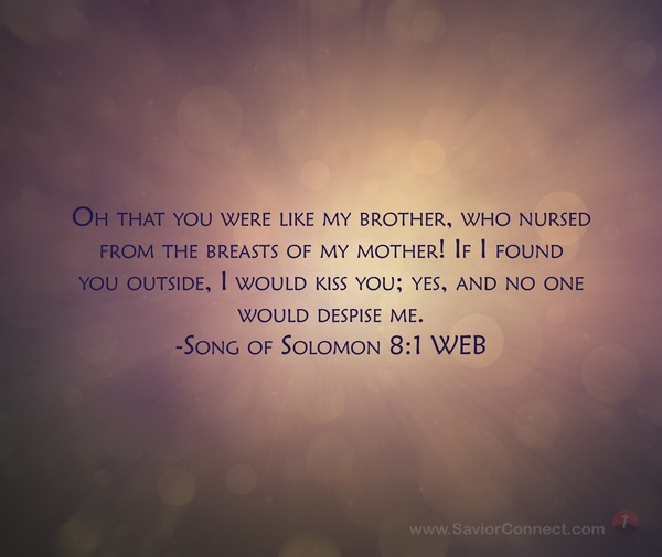 Oh that you were like my brother, who nursed from the breasts of my mother! If I found you outside, I would kiss you; yes, and no one would despise me. -Song of Solomon 8:1 WEB