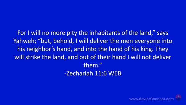 For I will no more pity the inhabitants of the land,” says Yahweh; “but, behold, I will deliver the men everyone into his neighbor’s hand, and into the hand of his king. They will strike the land, and out of their hand I will not deliver them.” -Zechariah 11:6 WEB