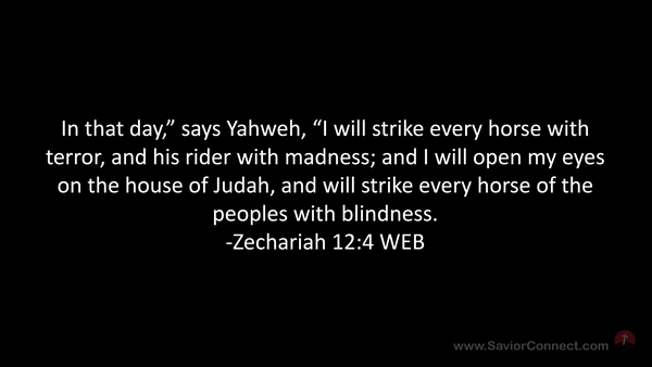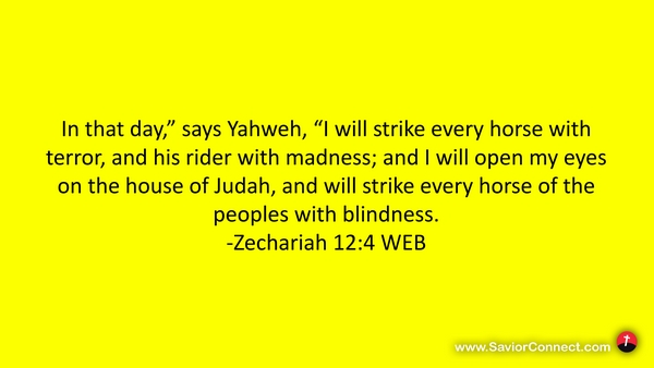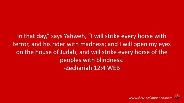 In that day,” says Yahweh, “I will strike every horse with terror, and his rider with madness; and I will open my eyes on the house of Judah, and will strike every horse of the peoples with blindness. -Zechariah 12:4 WEB
