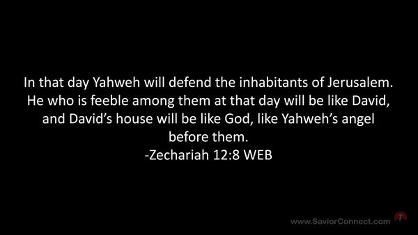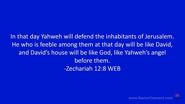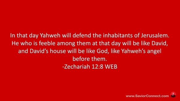 In that day Yahweh will defend the inhabitants of Jerusalem. He who is feeble among them at that day will be like David, and David’s house will be like God, like Yahweh’s angel before them. -Zechariah 12:8 WEB