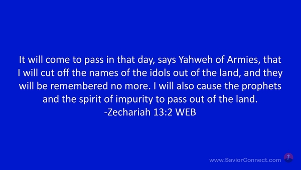 It will come to pass in that day, says Yahweh of Armies, that I will cut off the names of the idols out of the land, and they will be remembered no more. I will also cause the prophets and the spirit of impurity to pass out of the land. -Zechariah 13:2 WEB