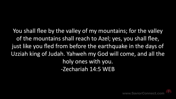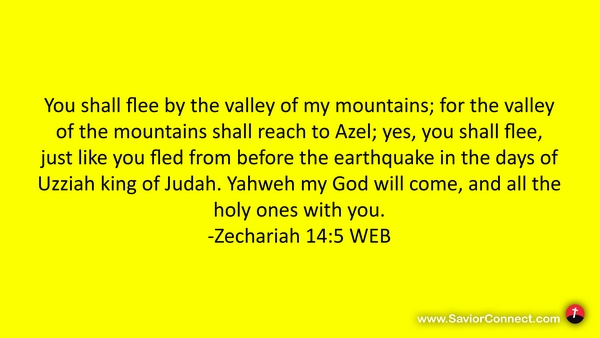 You shall flee by the valley of my mountains; for the valley of the mountains shall reach to Azel; yes, you shall flee, just like you fled from before the earthquake in the days of Uzziah king of Judah. Yahweh my God will come, and all the holy ones with you. -Zechariah 14:5 WEB