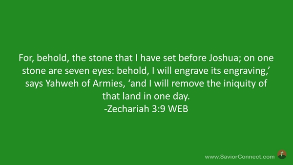 For, behold, the stone that I have set before Joshua; on one stone are seven eyes: behold, I will engrave its engraving,’ says Yahweh of Armies, 'and I will remove the iniquity of that land in one day. -Zechariah 3:9 WEB
