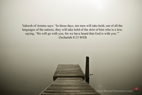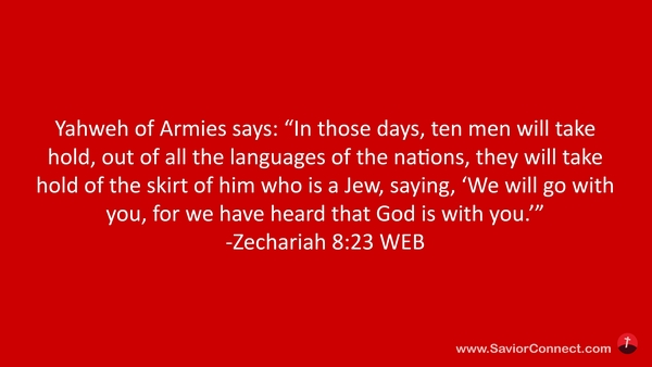 Yahweh of Armies says: “In those days, ten men will take hold, out of all the languages of the nations, they will take hold of the skirt of him who is a Jew, saying, 'We will go with you, for we have heard that God is with you.’” -Zechariah 8:23 WEB