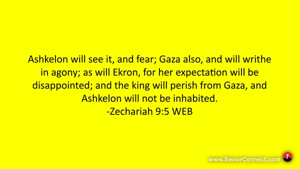 Ashkelon will see it, and fear; Gaza also, and will writhe in agony; as will Ekron, for her expectation will be disappointed; and the king will perish from Gaza, and Ashkelon will not be inhabited. -Zechariah 9:5 WEB